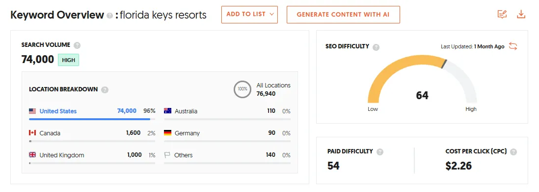 "Florida Keys Resorts" gets 74,000 monthly U.S. searches.